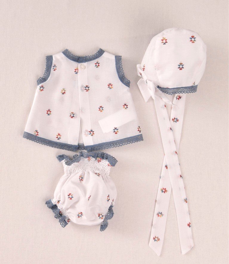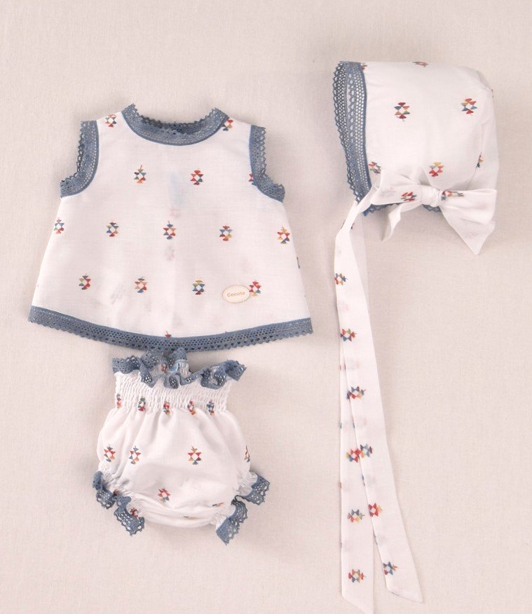 Conjunto tres piezas de la marca COCOTE, con tela de lino bordada y detalles de puntilla en color azul.
