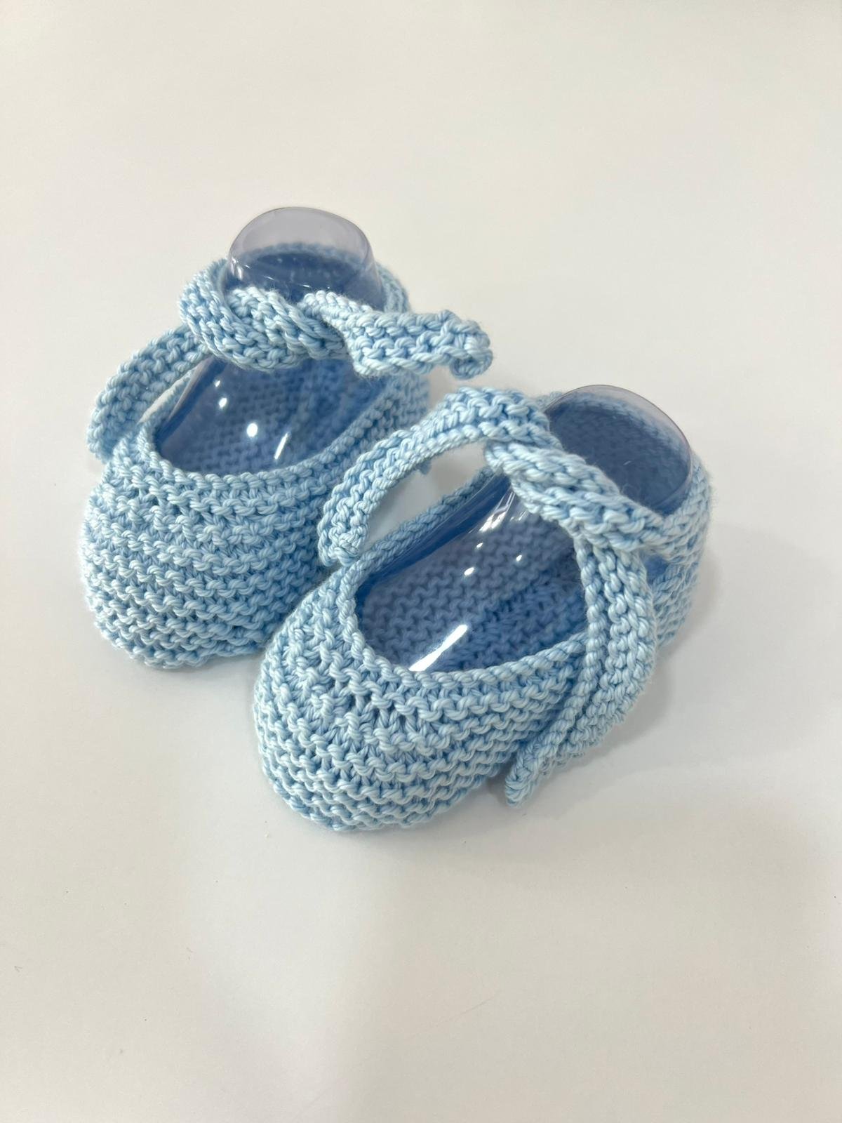 Patucos hechos a mano en algodón 100%, Color azul y diseño frontal en liso, Recomendables en talla 9-12M