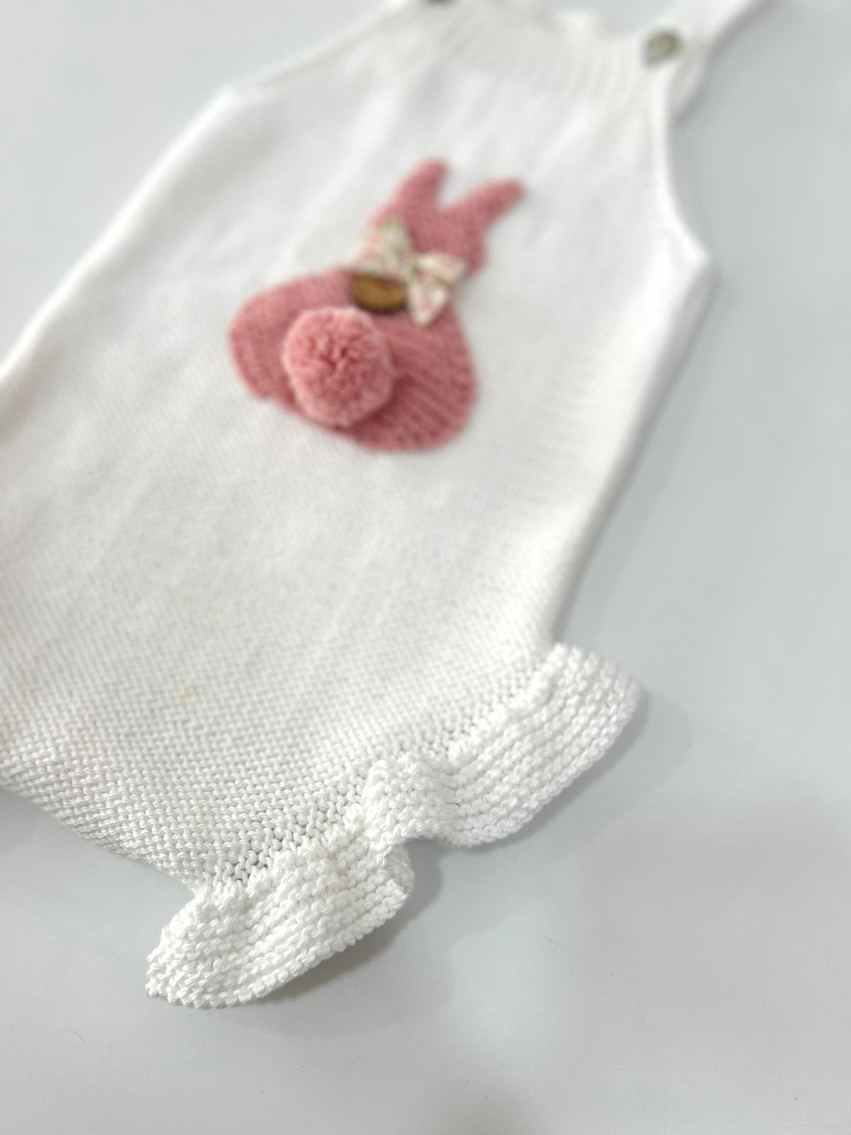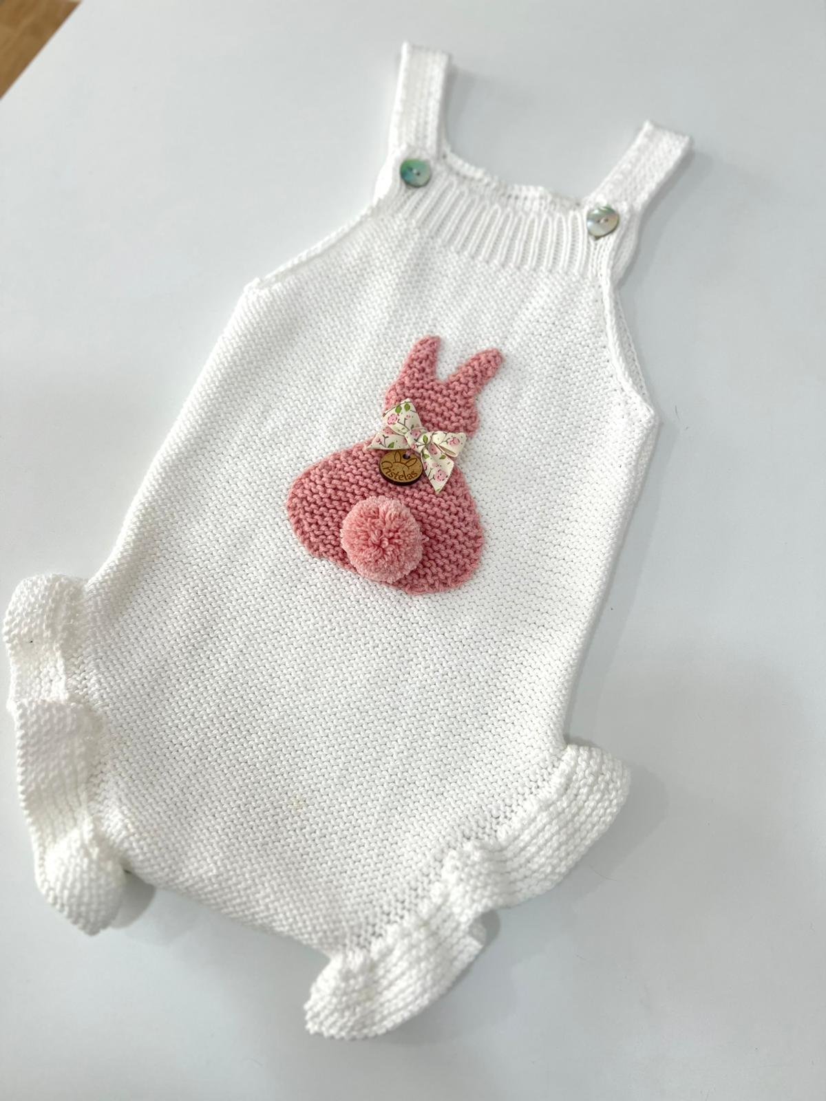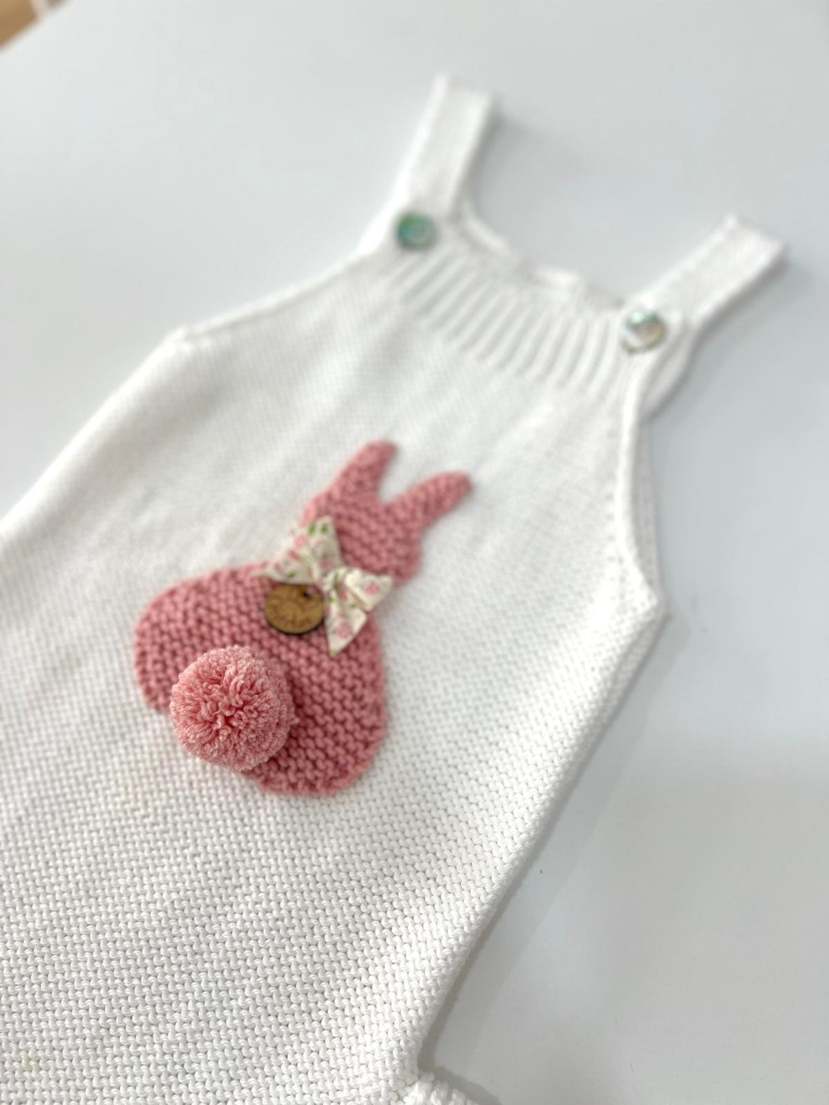 Pelele de tirantes hecho a mano en color crudo con detalle del conejito en rosa empolvado, da mucho margen de talla. Recomendamos para una talla 18-24M.