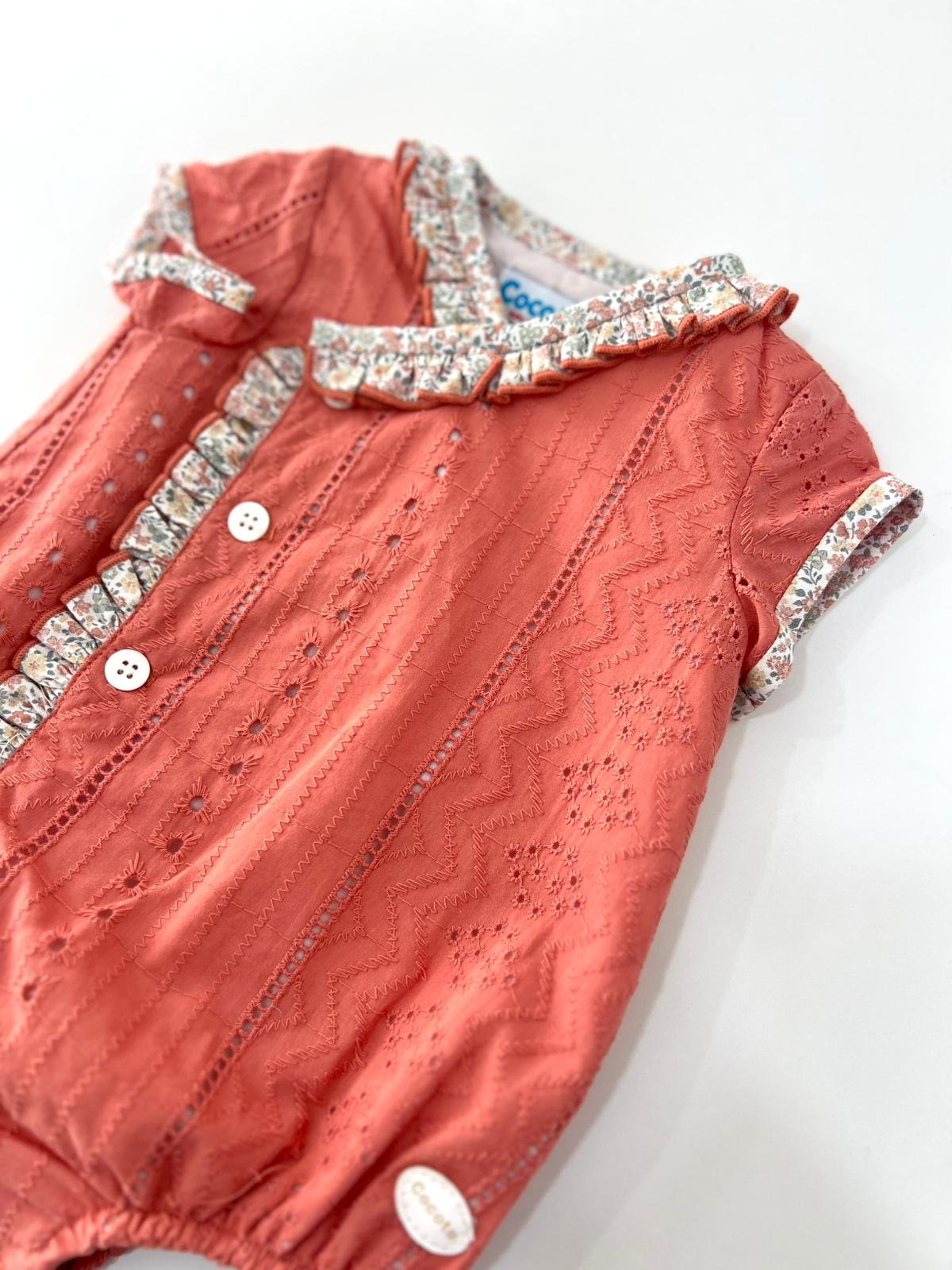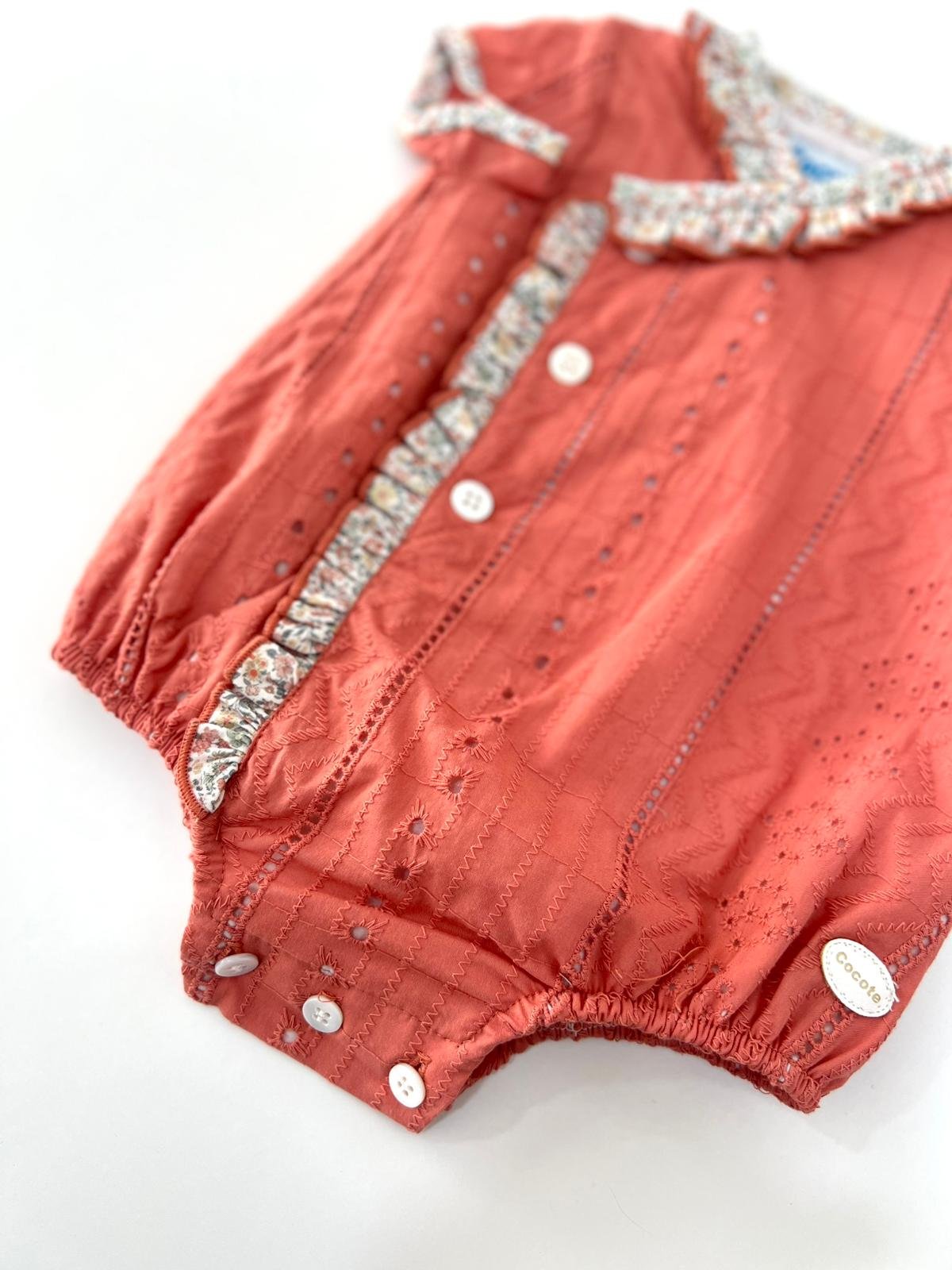 Pelele de la marca COCOTE, con tela perforada y diseño cruzado con detalles de tela en estampado de flores, es totalmente unisex, ideal para los próximos eventos.