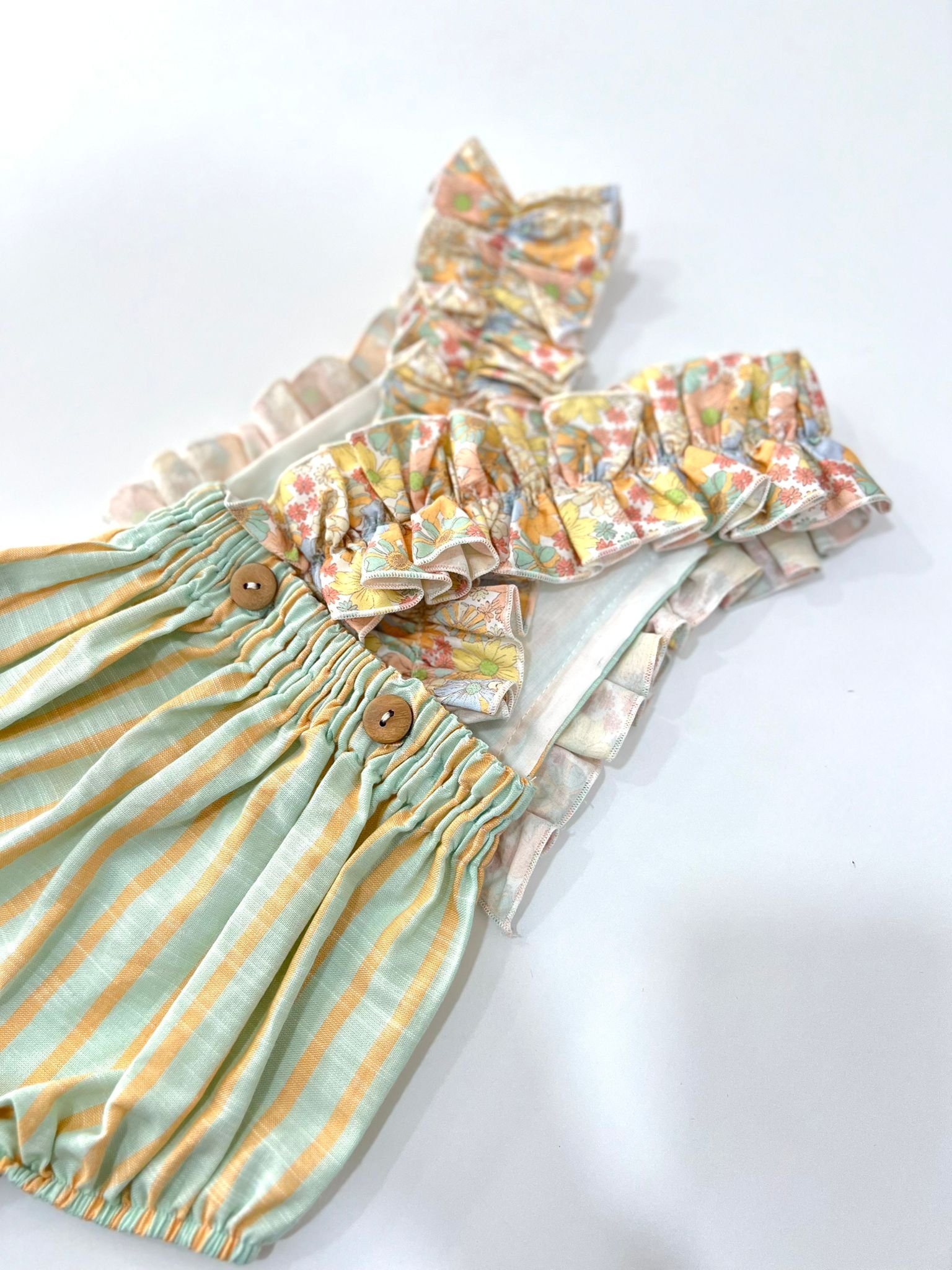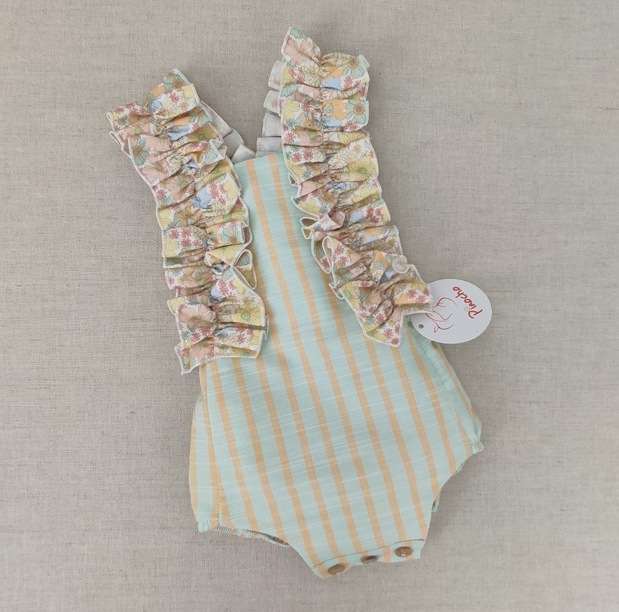 Rana estampada en tela de rayas, en tela de lino, combinada con tela de flores en volante, es ideal para verano.